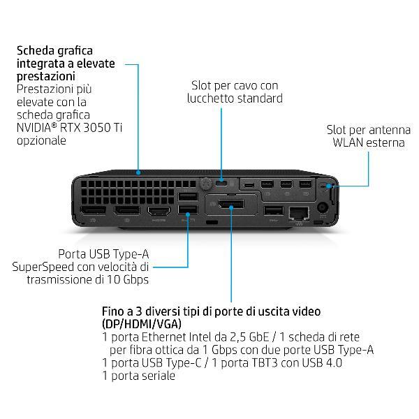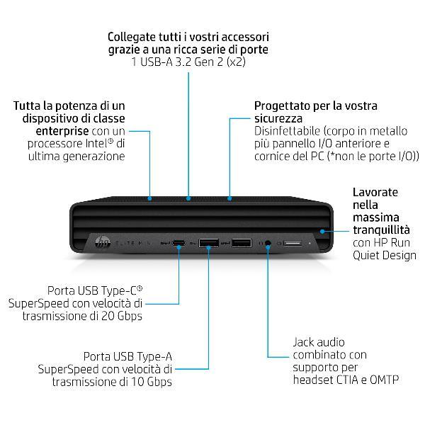 GENERALE Form Factor: Mini PC  |Wireless (standard): Wi-Fi 6E (802.11ax)  |Bluetooth: Sì  |Colore Primario: Nero  |Mouse: Ottico USB  |Raffreddamento a liquido: No  |Tastiera: Standard Usb  |Altoparlanti: No